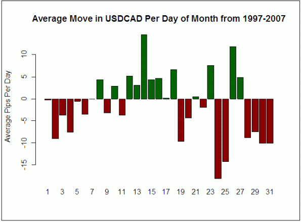 Looking at the table below, we see that a 10-year sample of data shows the biggest appreciation in the Canadian dollar against the US dollar happening in the final week of every month. In other words, on average, USDCAD falls 6 points per day in the final week - a result statistically below 0,at a 95% confidence level. Six points is hardly worth getting overly excited about since it is difficult to take advantage of such a small price move on a vague, weekly basis. However when we take a much more granular look of the USDCAD's behavior around specific days of the month, the moves become more substantial.