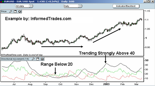 As the ADX Line is Non Directional, it does not tell you whether the market is in an uptrend or a downtrend (you must look to price or the DI/-DI Lines for this) but simply how strong or weak the trend in the financial instrument you are analyzing is. When the ADX line is above 40 and rising this is indicative of a strong trend, and when the ADX line is below 20 and falling this is indicative of a ranging market.
