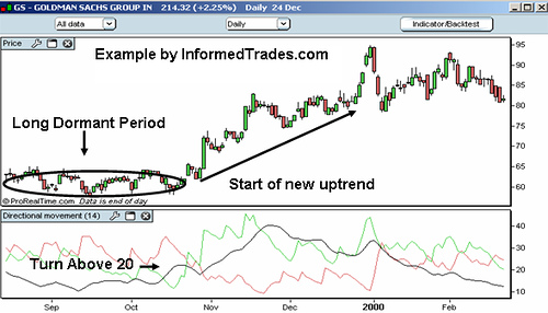 Another way that traders use this indicator is to identify the potential start of a new trend in the market. Very simply here they will look from below the 20 line to above the 20 line as a signal that the market may be beginning a new trend. The longer the market has been ranging, the greater the weight that most traders will give this signal