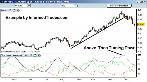 Another way traders use the ADX is as a signal of trend reversals. When the ADX is trading above both the DI line and the –DI line and then turns lower this is often a signal that the current trend in the market is reversing and traders will position themselves accordingly: