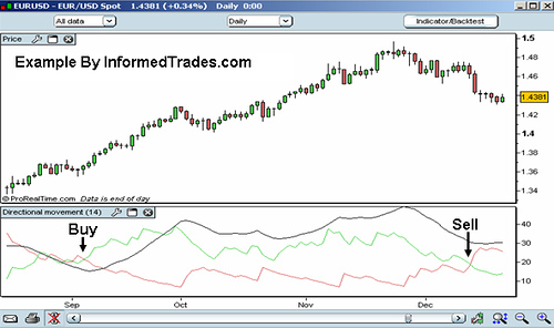 The final example that I am going to cover on how traders use the ADX is to position to trade long when the DI crosses above the –DI (as this is a sign that the buyers are winning out over the sellers) and to position to trade short when the DI line crosses below the –DI (as this is a sign that the sellers are winning over the buyers). As with the other crossover strategies that we have covered used alone, the DI crossover is prone to many false signals.