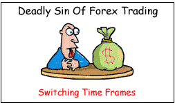 Switching time frames is a sin of buying or selling a currency pair in one time frame and trying to close the trade in another time frame. An example: A currency trader buys a pair with the idea of capturing couple of pips in the short term but the trade doesn't work out as planned (going to hit the stop loss) and now the trader suddenly decides to keep the trade as an intermediate trade, so basically, the trader switches from a smaller time frame to a bigger one.